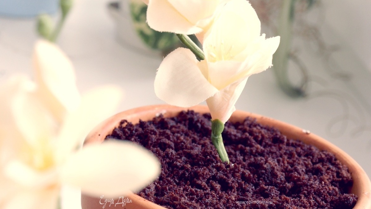 Тут я очухалась...забыла вставить трубочку! Помещаем её в центр, обрезанную по высоте горшочка --лучше сделать это в конце шага 4. Поверх мусса укладываем верхний слой коржика. Свержу присыпаем заготовленной бисквитной крошкой. Отправляем в холодильник на 3-4 часа или на ночь. - Шаг 9