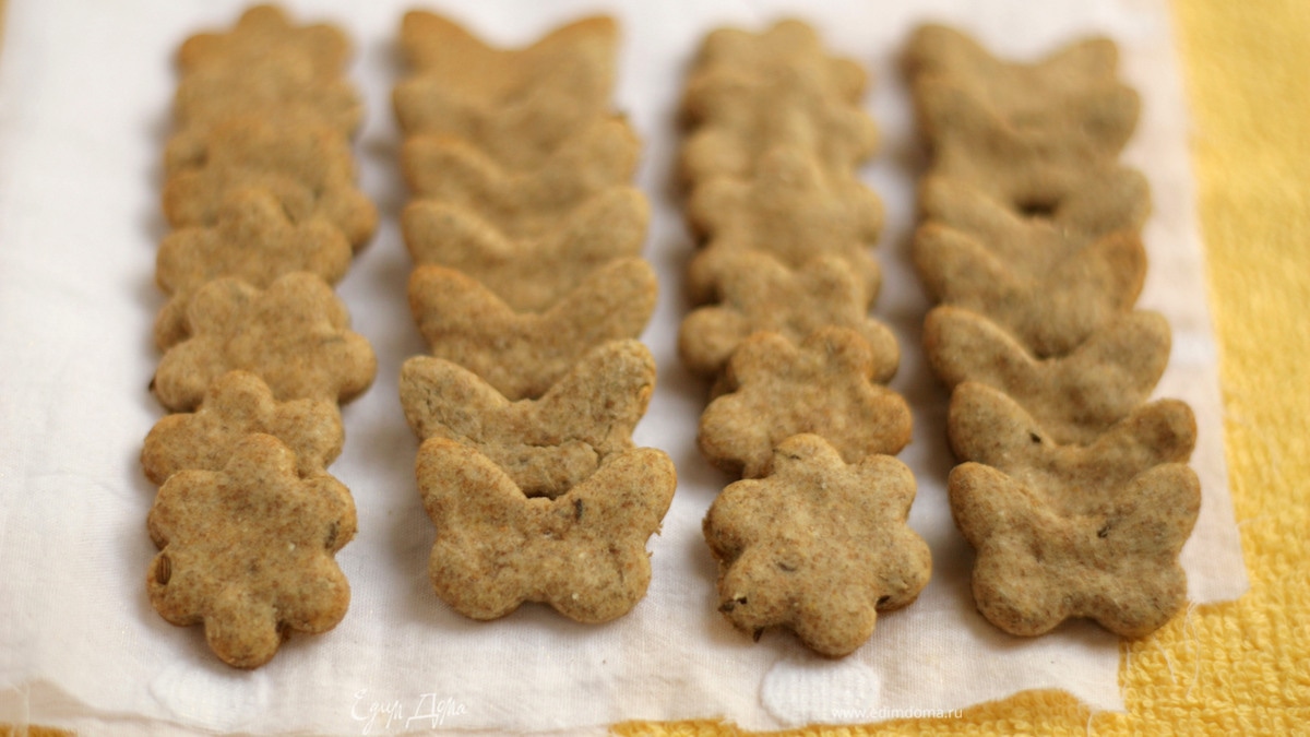 - Шаг 1Муку смешать с разрыхлителем. Добавить масло и растереть смесь в крошки. Добавить тмин и соль, перемешать.