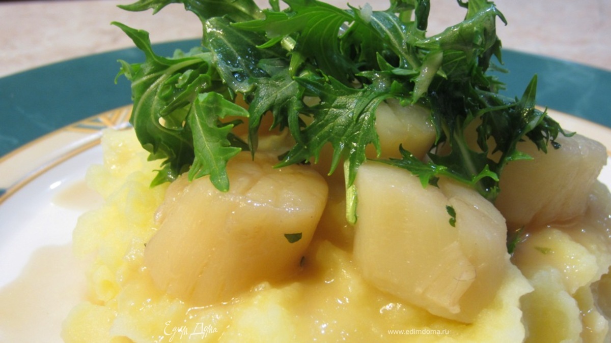 Выложите посередине тарелки теплое картофельное пюре. Выложите сверху гребешки. Сверху гребешков выложите несколько веточек салата, предварительно смоченного в лимонном соке. Полейте ложкой соус кругами на всё блюдо. Посыпьте сверху черным перцем и сбрызните оливковым маслом. - Шаг 8Важно! Не переварите гребешки. Лучше, конечно, использовать свежие гребешки. Соус получается очень нежным и с очень тонким вкусом. Думаю, что сюда даже лучше подходит полусладкое или полусухое вино. Используйте вино только то, которое вам нравится на вкус. Плохое вино никак не сможет дать хороший результат в соусе. Тем более вы испортите такое замечательное блюдо!Выбор вина действительно важен — оно задаёт основной тон вкусу соуса. Убедитесь, что вино гармонично сочетается с остальными ингредиентами блюда.