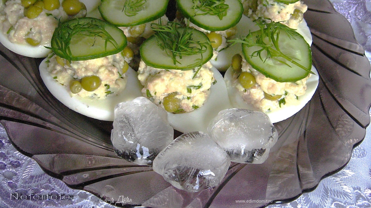 Сварить яйцо вкрутую,очистить.Соеденить печень трески(консервы) и желтки хорошо их размять,чтобы получилась однородная масса.Начинить этой массой половинки белков,украсить зеленью.