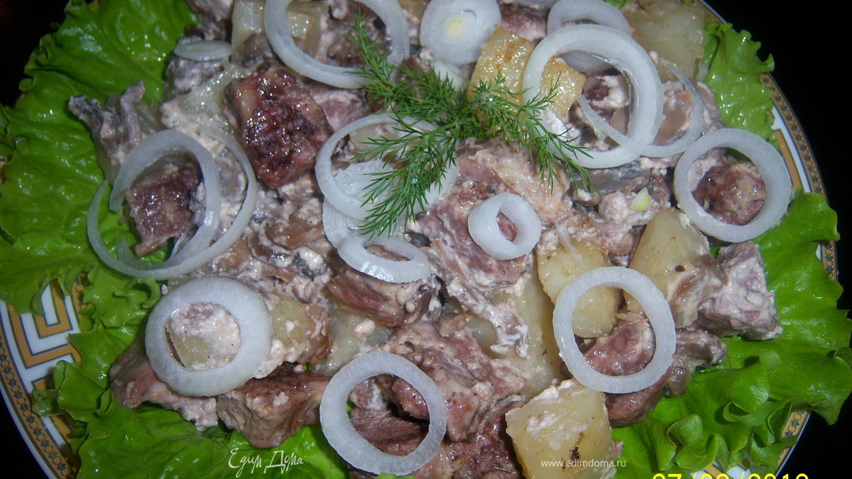 перед подачей лук нарезать тонкими кольцами, зелень мелко нарубить и положить сверху готового блюда. Приятного аппетита!