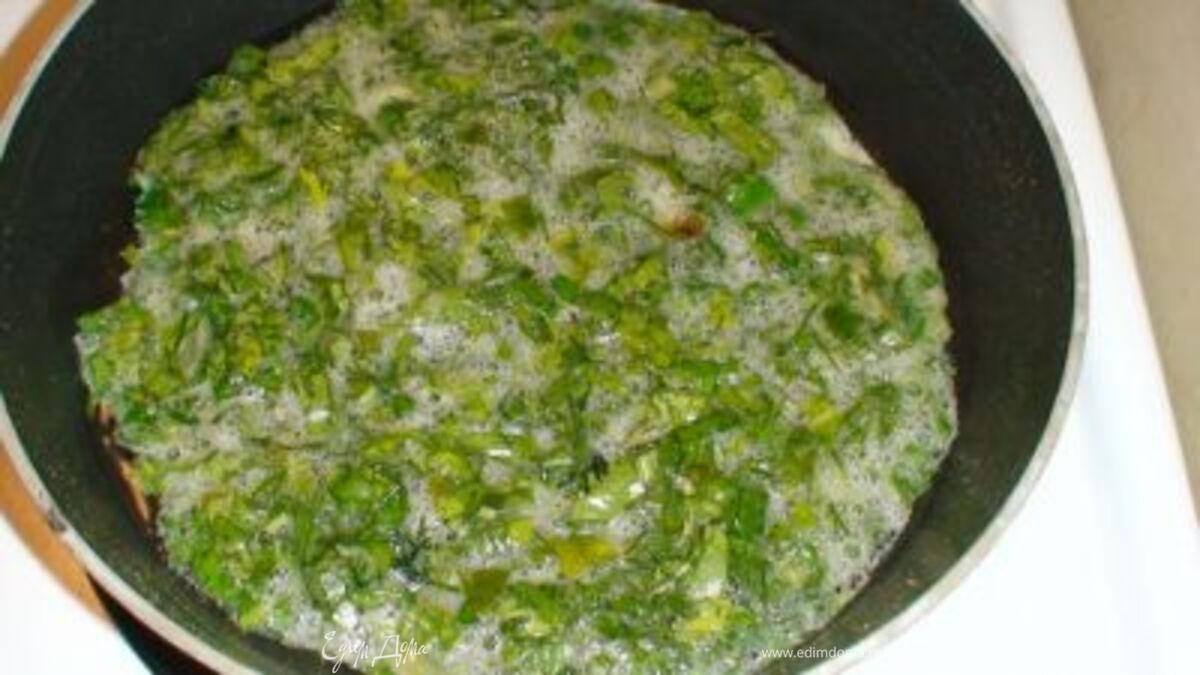 - Шаг 1Зелен.лук мелко нарезать и обжарить на топленном масле. Остальную зелень мелко порубить, соединить с обжаренным луком, посолить. Яйца взбить в омлет, добавив молоко. Влить яичную смесь в зелень и перемешать, выложить кю-кю на сковороду, разровнять. Жарить на маленьком огне под крышкой до полной готовности. Подавать нарезав треугольничками с подливкой из мацони и чесночка. Приятного аппетита!