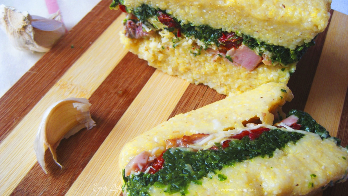 Террин из поленты с копченой курицей, шпинатом и вялеными томатами