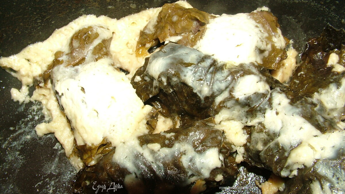 сделать фарш, не добавляя в него соль! т.к. виноградные листики очень соленые. Добавить перец и немного воды при необходимости. Нафаршировать листики фаршем, выложить на сковородку и тушить под крышкой минут 15 в собственном соку, как только вся влага испарится, залить кефиром и тушить еще минут 15-20. Приятного аппетита!