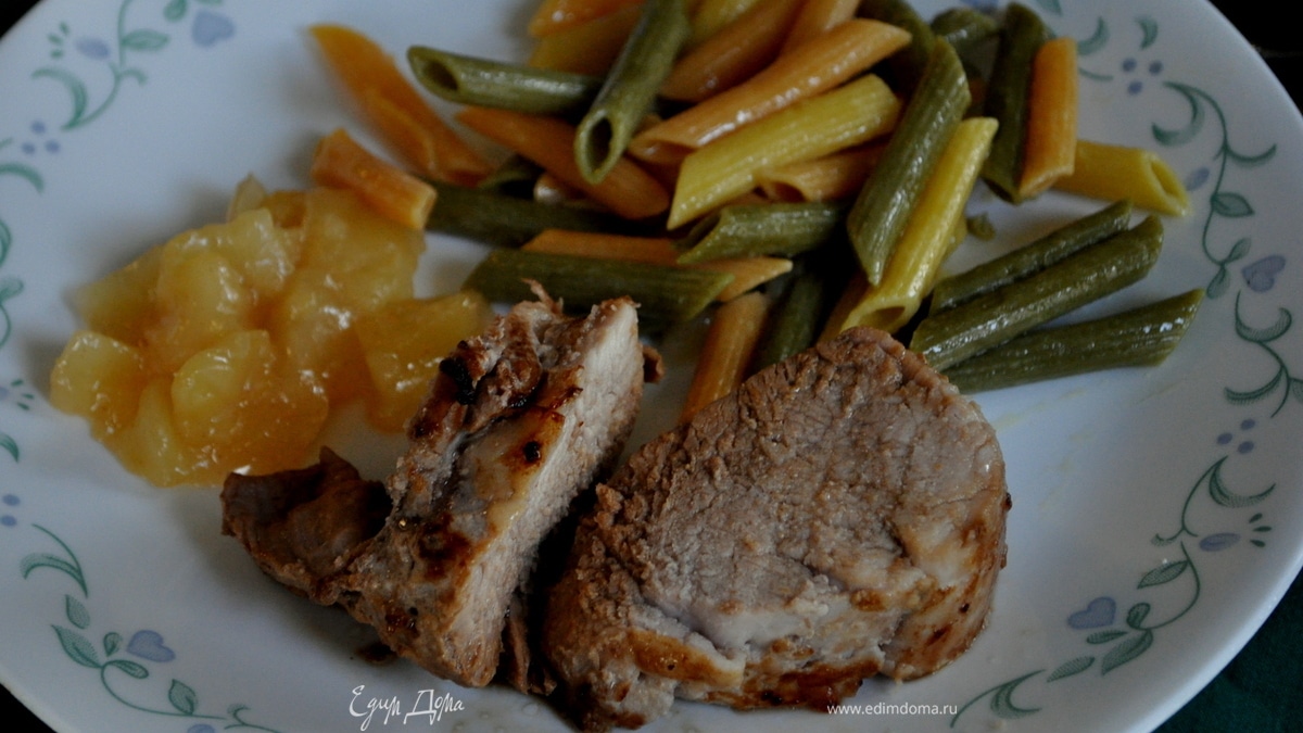 По рецепту мясо предполагается делать на гриле.Я поменяла режим гриля на духовку.Разогреть духовку до 200гр.Поставить свинину в духовку без маринада. 40мин. готовить не прикрывая. Добавить сверху маринад и поставить обратно в духовку на 20мин.Дать отдохнуть 5мин .и подавать с гарниром , разрезав мясо на порции.