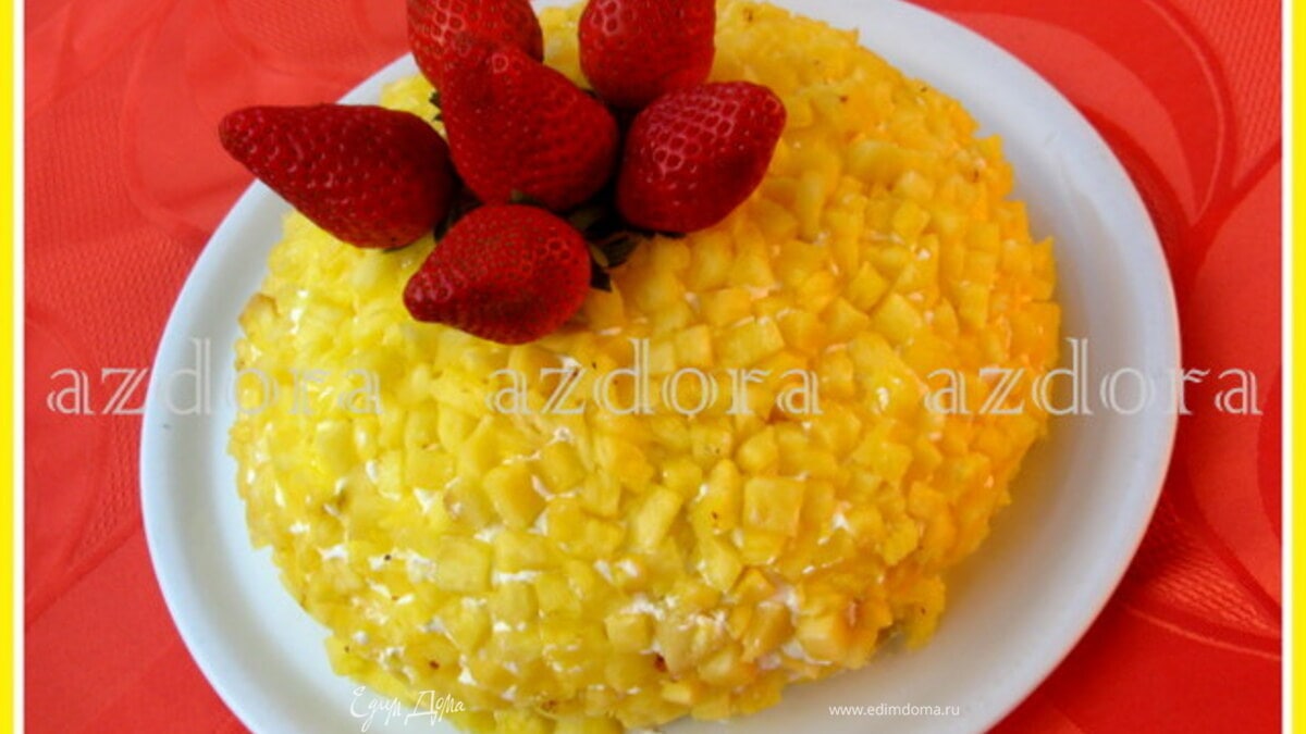 Ананас нарезать на мелкие кубики. Украсить торт кубиками ананаса.