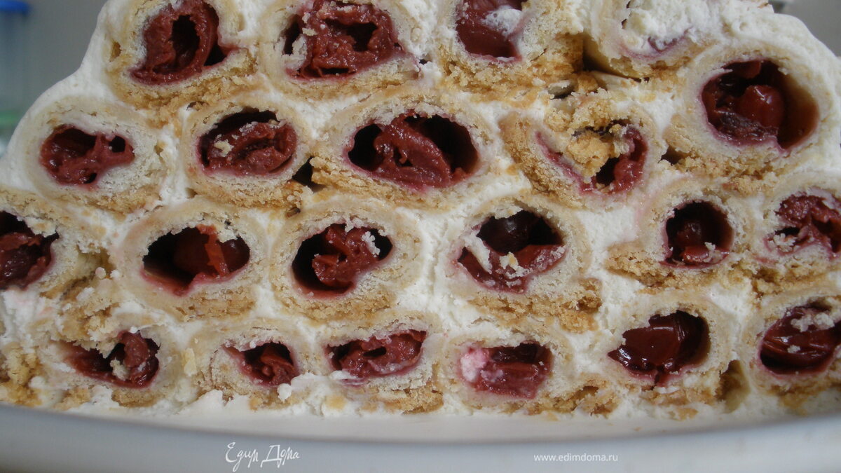 - Шаг 1Масло натереть на крупной терке и перетереть с мукой (или порубить с помощью ножов сс мукой). В масляную крошку добавьть муку и гашеную уксусом соду и замесить тесто. Раздельть его на части, приблезительно на 21 (у меня было 28). Поставить его на 1 в холодильник. Затем каждый кусочек теста раскатать достаточно тонко, пложить на край ряд вишен и скатать рубочкой. Трубочки испечь до румяного цвета в рахогретой до 190 градусов духовке, остудить. Сметану взбить с сахаром. На широкое блюдо выкладывать трубочки пирамидой, перемезывая каждый слой кремом: крем – 6 трубочек – крем – 5 трубочек и т.д. Сверху последняя трубочка. Весь торт смазать кремом и поставить на пару часов в холодитьник. Перед подачей украсить тертым шоколадом.