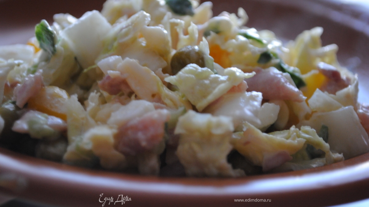 - ПодготовкаНарезать китайскую капусту. Кстати, чем больше капусты, тем больше получится салата. Нарезать перец. Натереть на крупной терке огурец, ветчину, сыр. Отварить в крутую яйца и также натереть их на крупной терке. Добавить 1 банку горошка.Посолить. Заправить майонезом. Приятного аппетита!