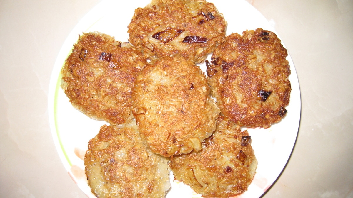 - Шаг 3К этой массе добавьте овсянку и все тщательно перемешайте. Обмакивая руки в воде, сформируйте котлетки. На хорошо разогретую сковородку выложите котлеты и жарьте на среднем огне, накрыв крышкой.