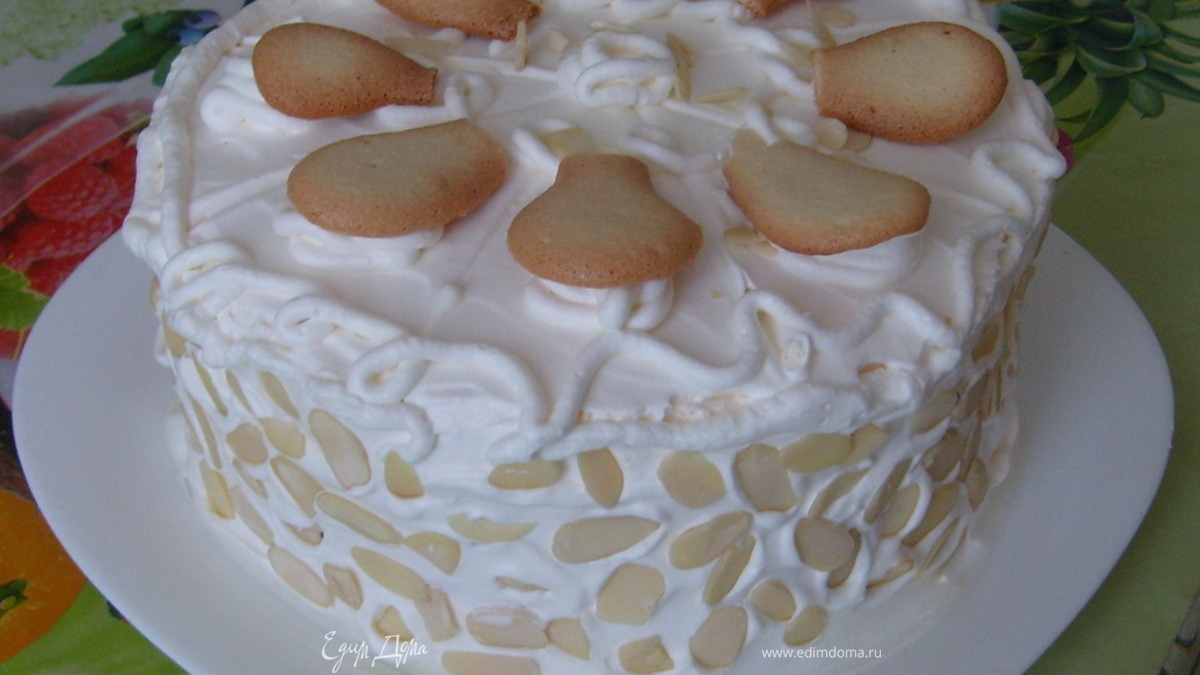 Для украшения взбить сливки. Обмазать торт со всех сторон. Наметить порции торта. Выдавить на каждый кусочек розочки из крема, уложить на них половинки печенья. Украсить края и поверхность торта миндальными хлопьями и полосками апельсиновой цедры.