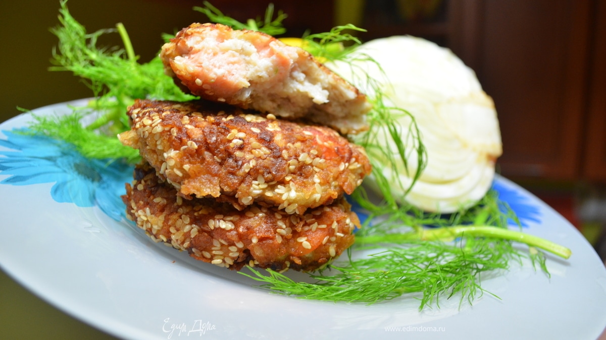 Приготовление: Хлеб замочить в воде. Филе морского языка, крабовые палочки ,лук и фенхель пропустить через мясорубку. В фарш положить хлеб, яйцо, посолить, поперчить и вымешать. Семгу порезать на мелкие кусочки и добавить в фарш. Хлопья размять , в целлофановом пакете, и добавить кунжут. Котлеты запанировать и жарить в оливковом масле до готовности. Подавать с рисом , булгуром или кусками картофеля с зеленью. МИР ВАМ!