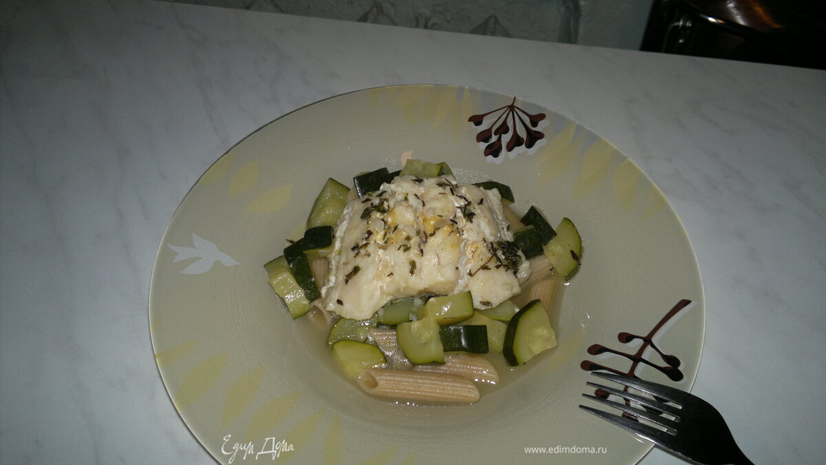 Треска с цукини в лимонной цедре с чесноком, пастой пенне из муки дурум