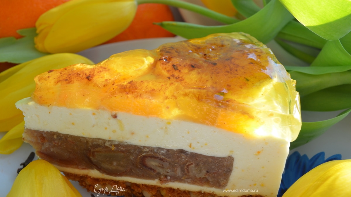 Сборка: Края съемной формы обмотать пищевой пленкой, вкладываем песочный корж, 1/3 творожной начинки, финиковое желе, 2/3 творожной начинки. Убираем в холодильник на 2 часа . Выкладываем апельсины и заливаем 1\2 желе когда прихватится еще 1 /2 .Убираем в холодильник на 6 часов или на ночь. МИР ВАМ!