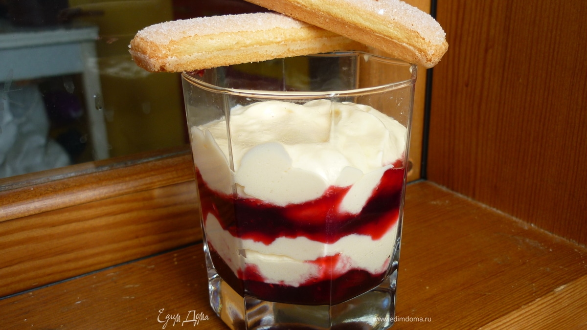 Выкладываем слой вишни-слой крема-слой вишни-слой крема.Украшаем бисквитом савоярди и приятного аппетита!!!