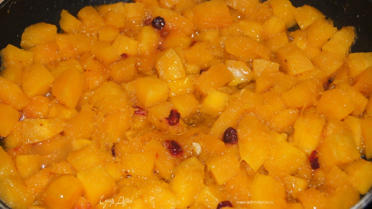 - Шаг 1Тыкву порезать, быстро обжарить на оливковом масле, добавить размятый чеснок (не пропускать через пресс), клюкву. Перемешать, немного потушить, добавить бульон (лучше из баранины). Можно приправить тертым имбирем и корицей