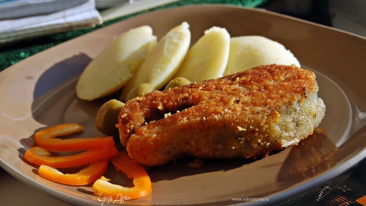 - Шаг 1Рыбку разделать на порционные кусочки, посолить, поперчить. Обвалять в муке. Яйцо взбить вилкой, обмакнуть в яйцо и в панировку из сухарей, сыра, и петрушки. обжарить по 5 минут с каждой стороны