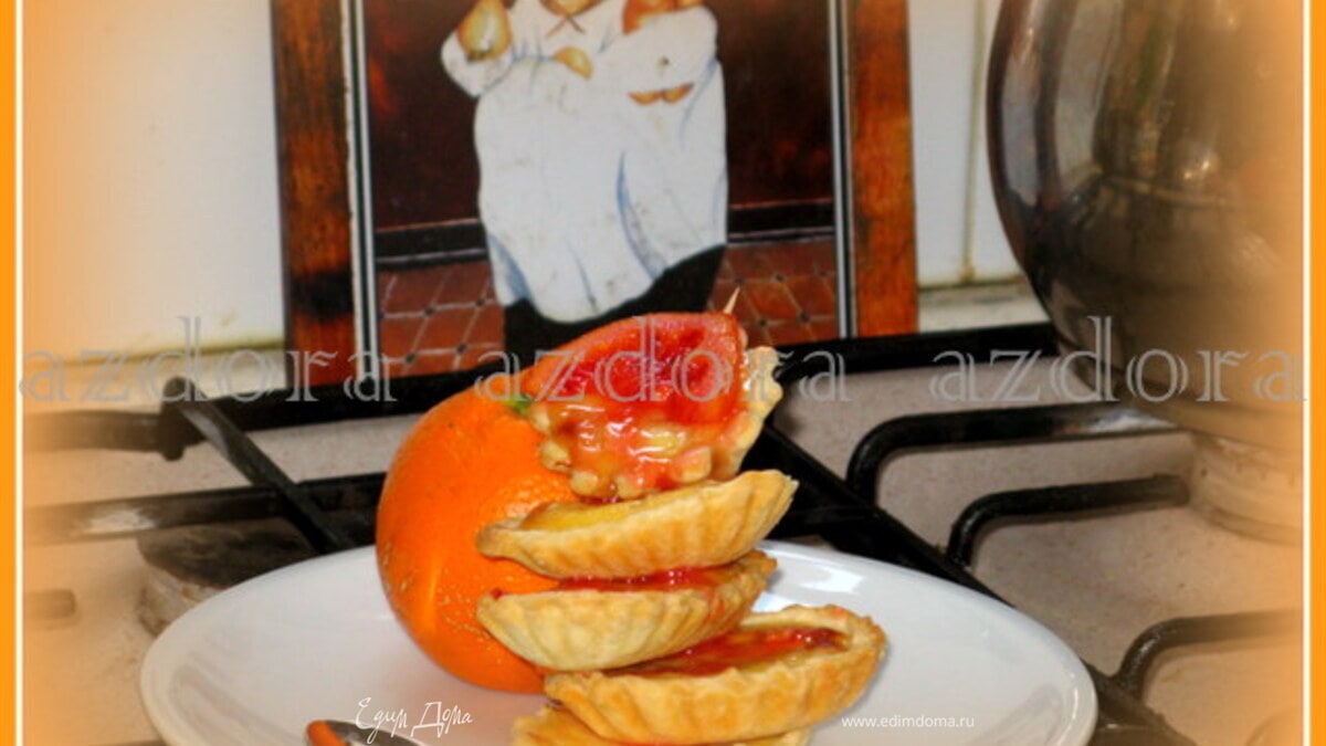 Достать цитрусовые и остудить на решётке. - Шаг 10Готовые тарталетки остудить, смазать получившимся сиропом и украсить ломтиками цитрусовых.