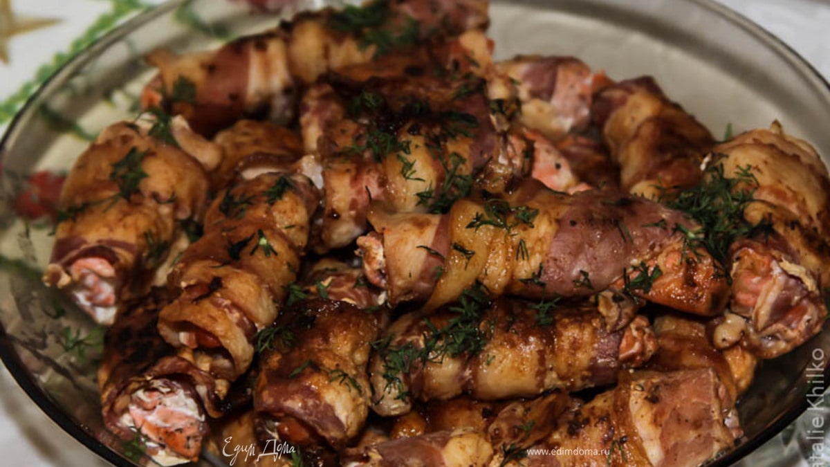 - Шаг 1лосось порезать на длинные кусочки, завернуть в бекон и обжарить