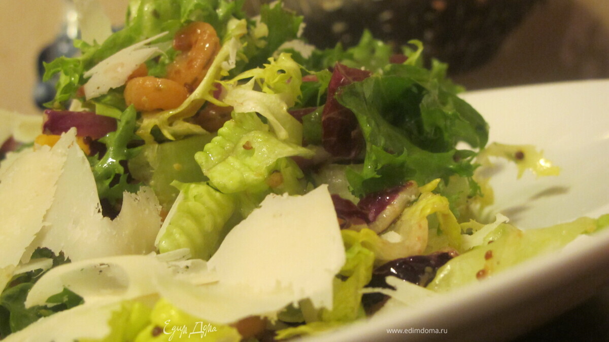 Салатный микс с креветками, пармезаном, хурмой и горчичной заправкой