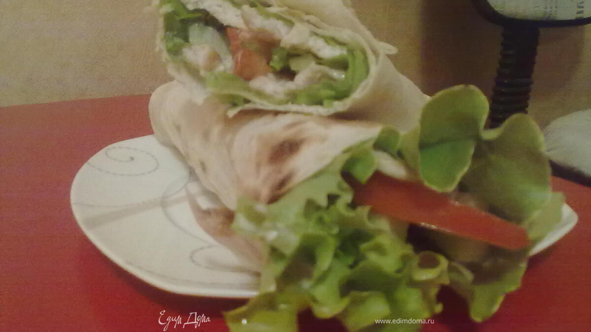 - Шаг 4Начинаем собирать рулетик. На край лаваша выкладываем 3 листа салата, смазываем из соусом, кладем курочку, смазываем соусом, затем овощи, сверху еще раз соус и аккуратно заворачиваем. После чего рулетик можно положить на решетку в духовку и подогреть его) Приятного)