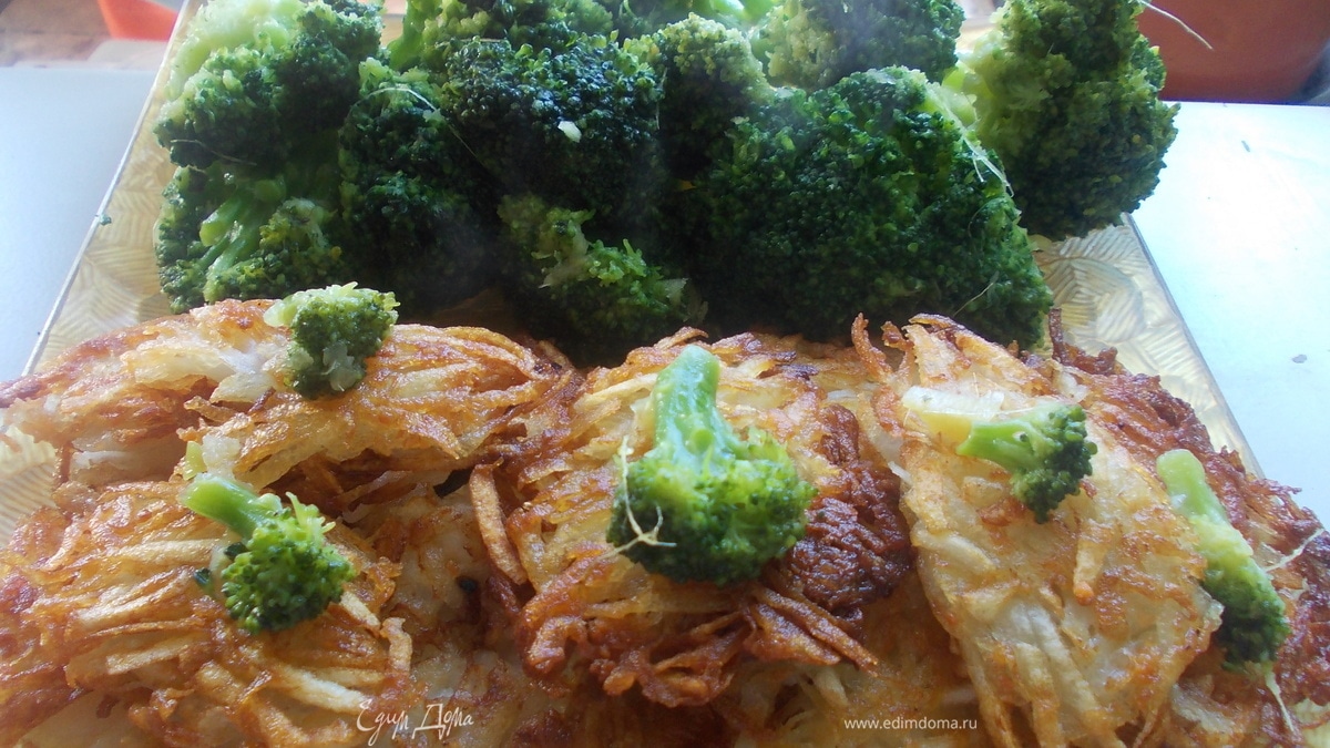 В сковороде вок раскалить растительное масло, добавить соли и мелко нарубленного имбиря и обжарить в масле брокколи в течение 3-5минут,затем добавить сахар, куриный бульон и устричный соус, перемешать и тушить брокколи в соусе еще минуту.Выложить на блюдо брокколи и лепешки картофельные и подавать.Вот такой вот обед.Приятного аппетита!