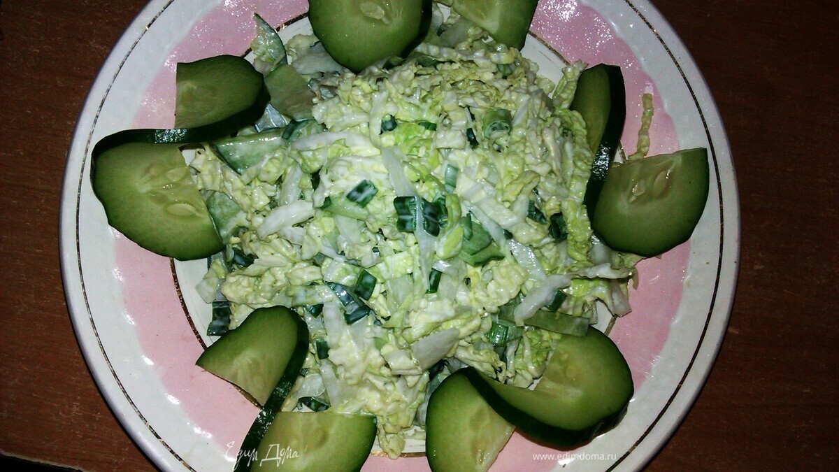 - Шаг 1пекинку нашинковать.огурец порезать соломкой.лук измельчить.все смешать,заправить майонезом и посолить.салат готов.