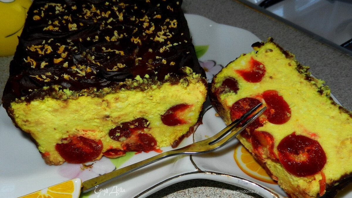 Вишню замочить в кипятке на 15 минут. Творог протереть через сито (я взбила в блендере). Отделить белки от желтков. Взбить желтки + сахар+ванильный сахар до однородной глянцевой массы. Добавить к творогу, туда же добавить цедру лимона, куркуму+крахмал. Всё перемешать или слегка взбить миксером. Белки взбить до пиков и аккуратно ввести в тесто. Застелить форму для кекса пергаментом, выложить тесто и запекать в духовке разогретой до 180 градусов 50 -60 минут. Когда сырник остынет полностью достать его из формы и полить глазурью. Для глазури – смешать сахарную пудру, какао, крахмал и потихоньку по по-ложки влить туда ледяную воду, постоянно помешивая. Дать постоять готовому сырнику в холодильнике минимум 4 часа.