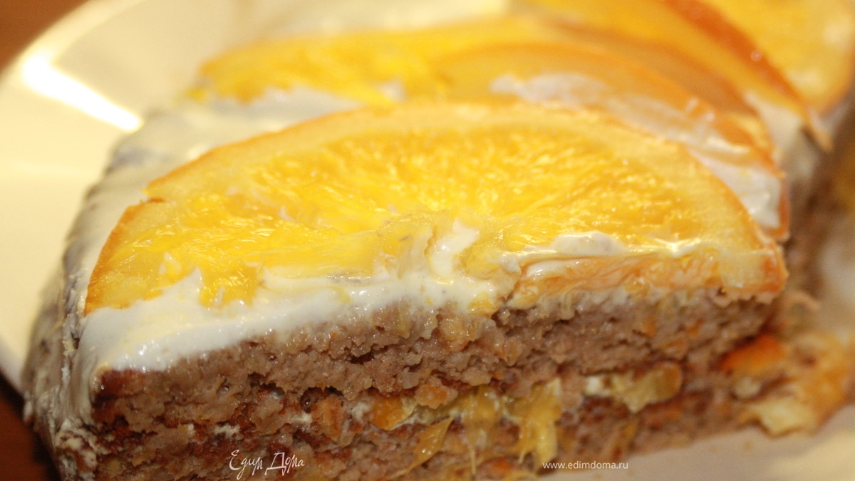 сметану взбить с сахаром , добавить сок и цедру лимона. данную смесь использовать в качестве прослойки. украсить верхний корж кремом и дольками второго апельсина. Получается очень просто, оригинально, а главное вкусно!!!