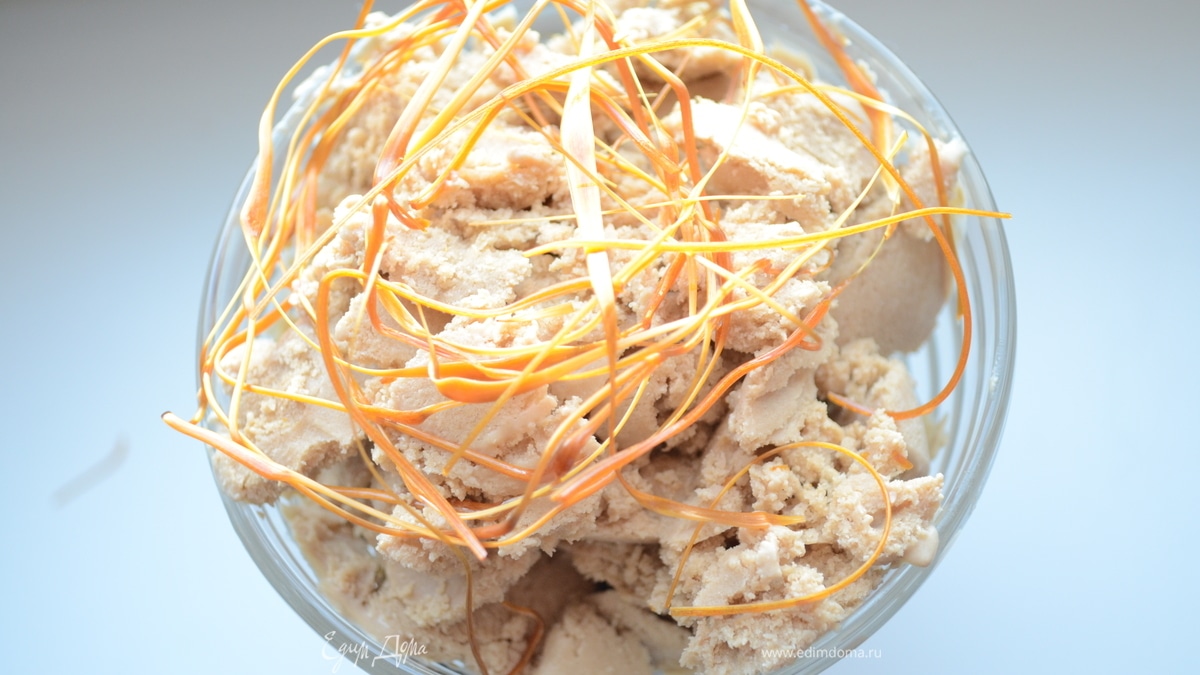 Дать остыть, когда карамель минут через пять начнет густеть, начать помешавать вилкой. Нужно добиться такой консистенции, чтобы ниточка карамели тянулась за вилкой и застывала в воздухе. Дальше можно уверенно чувствовать себя девушкой из старой немецкой сказки, которой надо было прясти из соломы золото))) в общем, полет фантазии не ограничен. Я укладывала кольцами, часть поломала в стружку и добавила в мороженое... - Шаг 5Приятного аппетита!