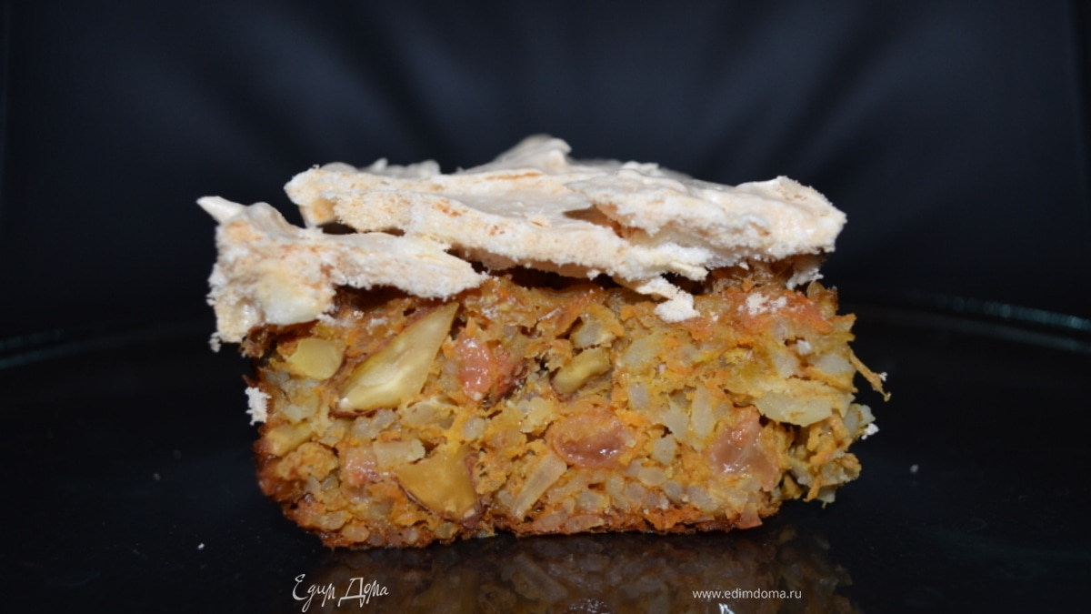 - Шаг 2Морковь и яблоко натереть...к каше добавить мёд, пряности, изюм, орехи, яблоко, морковь, яйца. Выпекать 15 мин при 200град, сверху выложить меренгу и томить ещё 40мин при 170гр.
