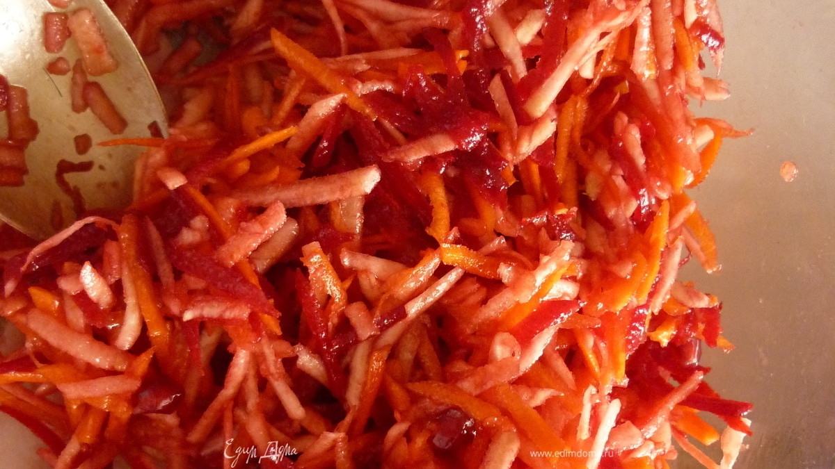 На крупной тёрке, а у кого есть немецкая шинковка - ещё лучше, шинкую сырую свеклу. - Шаг 2