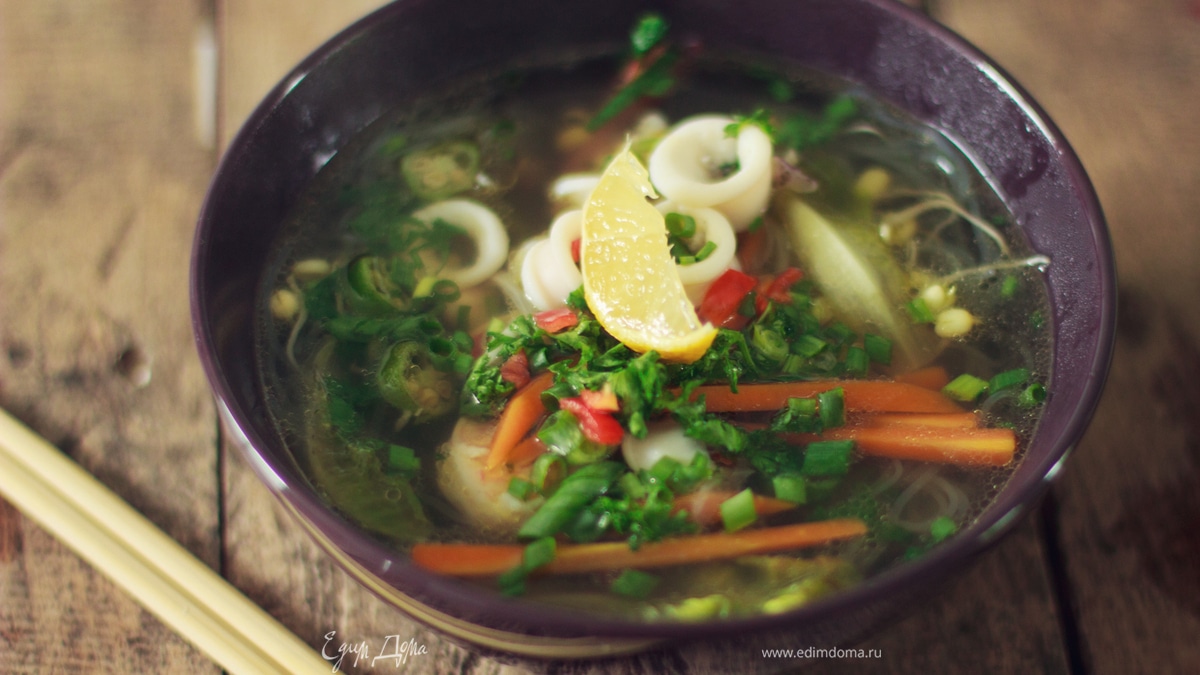 Фо — отличное начало дня, когда хочется чего-то согревающего. Фо — вьетнамский суп с лапшой, в который при сервировке добаляется говядина или курица (в нашем случае морепродукты, я не ем мясо). Если хочется с мясом, то просто вместо морепродуктов положите в тарелку очень тонко нарезанную говядину (сырую) или курицу. Ароматный, насыщенный и довольно простой в приготовлении. Некоторые продукты взаимозаменяемы, некоторые вообще можно исключить (кроме соусов )