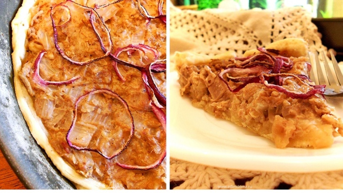 - Шаг 4Выложим начинку на тесто, сверху - порезанные тонкими колечками лук Печем пирог 25-30 минут при температуре 180 градусов. ПРиятного аппетита!