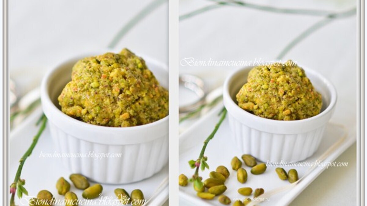 - Шаг 1Фисташки смолоть.Смештаь миндальную и фисташковую муку. Добавить 1-2 капли миндального экстракта