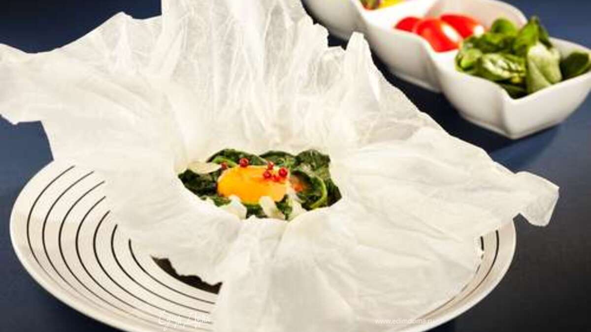Сформируйте в шпинате углубление и выбейте в него яйцо. - Шаг 5Сверните и свяжите бумагу SAGA в форме пакетов и поместите эти пакеты в кипящую воду примерно на 5–6 минут (в зависимости от того, какую консистенцию яйца вы хотите получить).