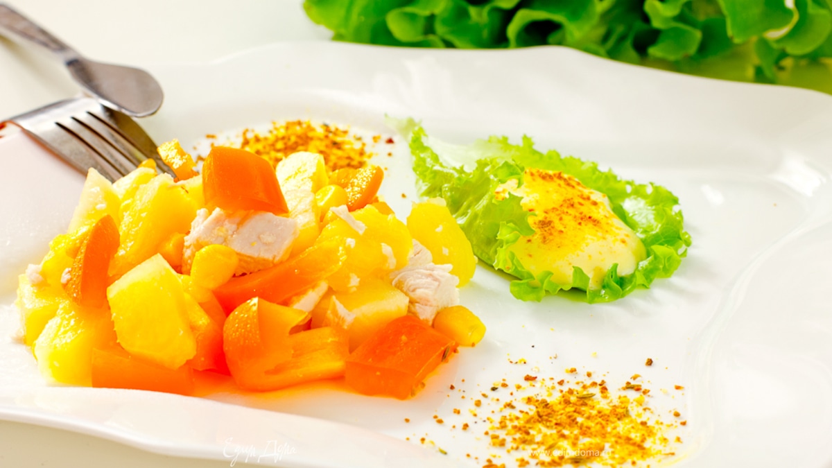 Готовим соус: смешиваем майонез и соус карри. Добавляем карри молотый и белый перец. Соус подаем к салату.