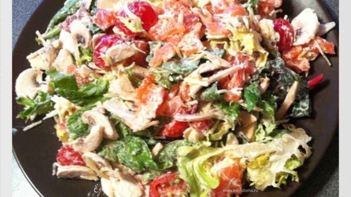 - ПодготовкаСалаты вымыть, обсушить, высыпать в салатницу.Грибы вымыть и нарезать. Помидорки разрезать на половинки. Рыбу мелко порезать. Все это выложить в салатницу, добавить майонез,пармезан и хорошо перемешать. Соль, перец по вкусу.