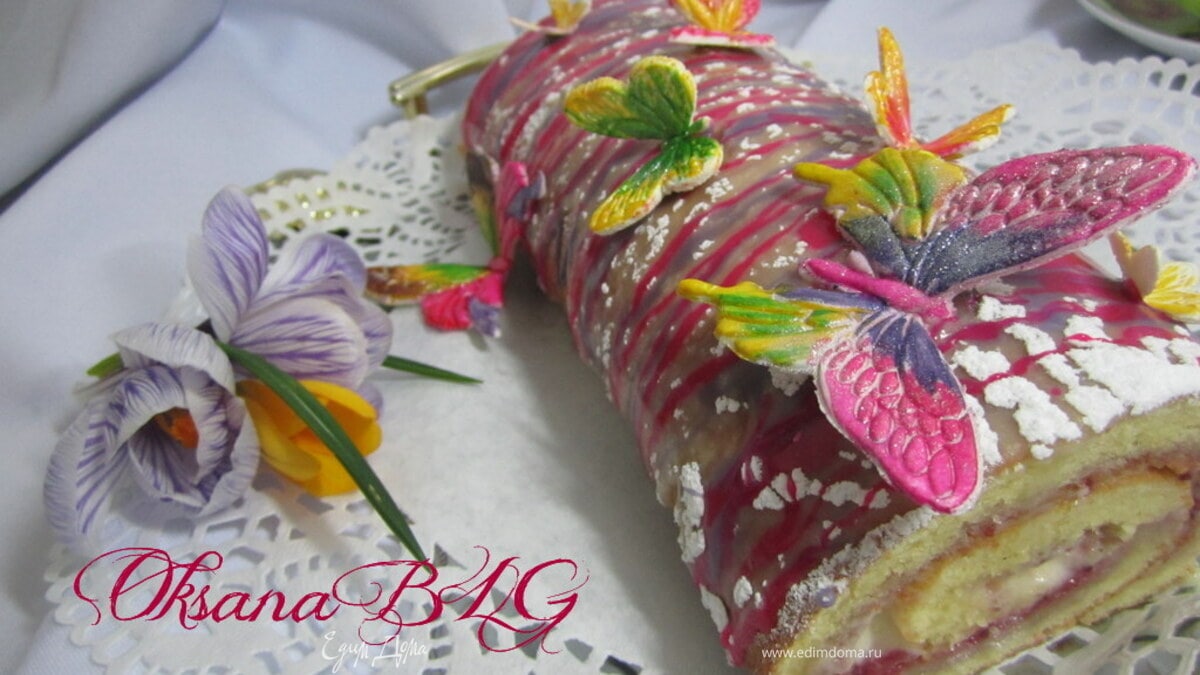После охлаждения торт покрыть растопленным шоколадом или взбитыми сливками или же просто притрусить пудрой. В моем варианте рулет сверху притрушен пудрой, на пудру нанесено полоски разноцветного шоколада и добавлены мои любимые бабочки. - Шаг 20