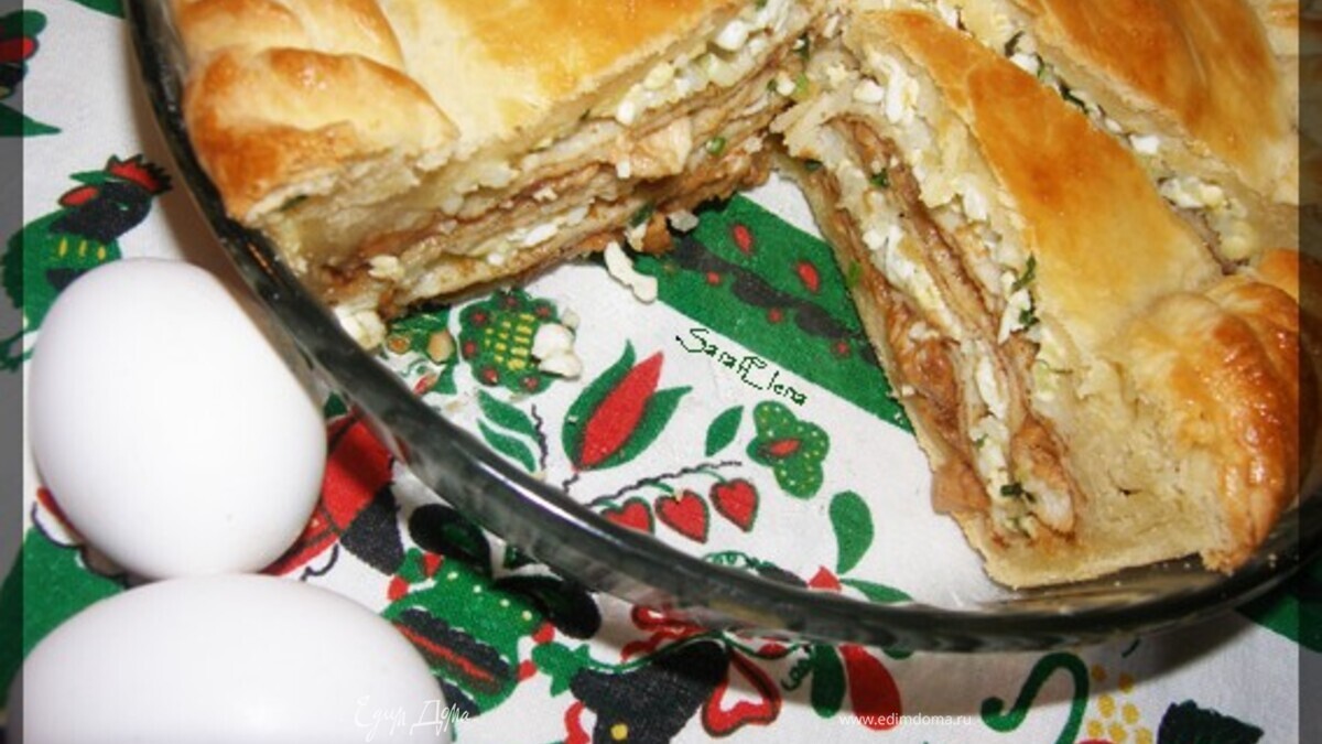 Сборка: на нижний пласт теста идет половина второй начинки, сверху 2 блина, затем половина первой начинки + 2 блина, и еще раз оставшаяся часть начинки второй + 2 блина, и оставшаяся первой, сверху накрываем верхним пластом теста. Сделать сверху небольшую дырочку, влить 3 ст.л. куриного бульона. Верх пирога я смазала взбитым яйцом.