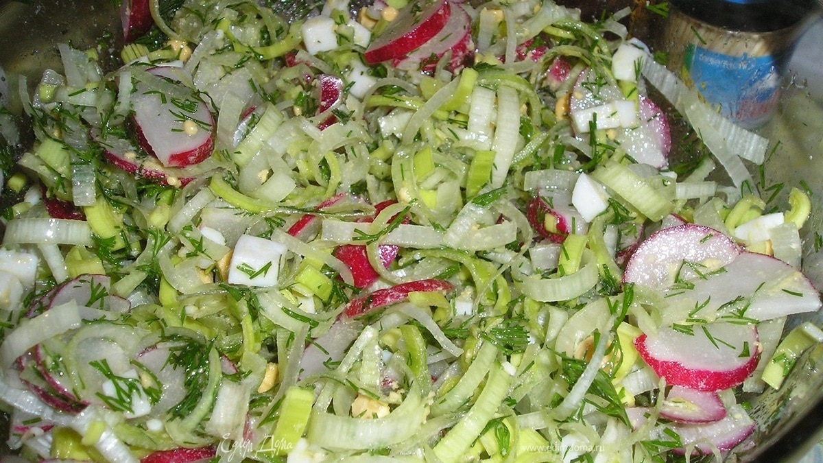 Редис и лук порей нарезать кружочками, мелко накрошить яйца и укроп, заправить по вкусу маслом, сметаной или майонезом. Приятного аппетита!!!