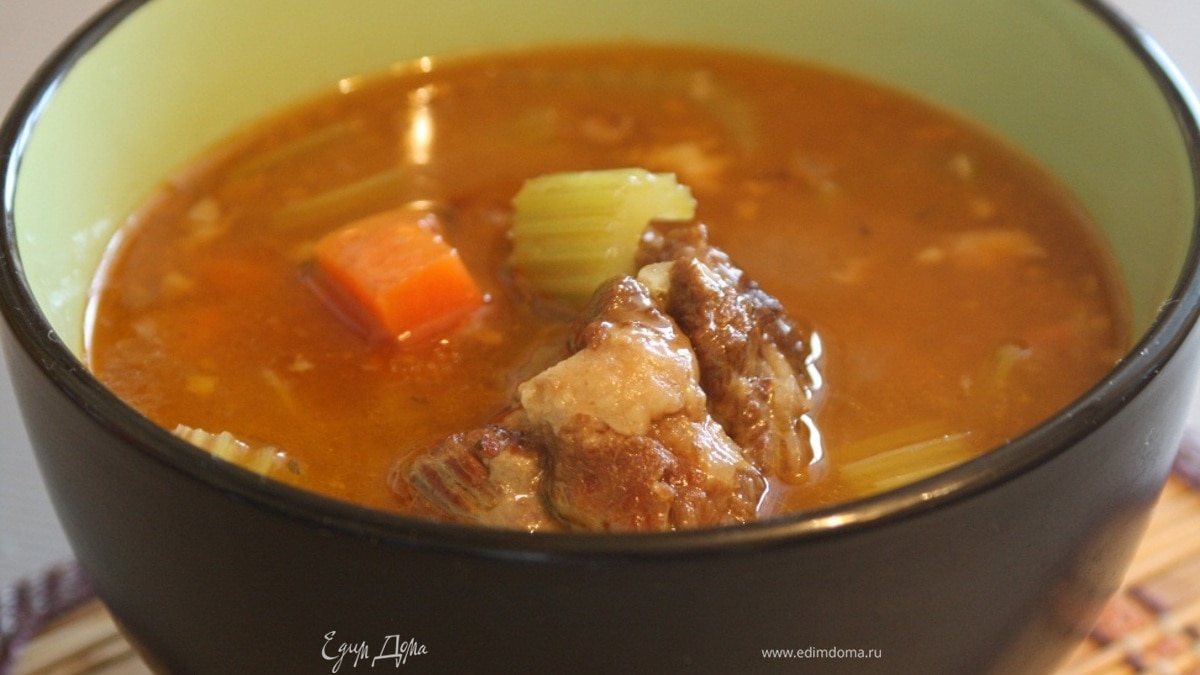 - Шаг 4Через 3 часа и 15 минут добавить в суп вино, морковь и сельдерей. Варить еще 15 минут.