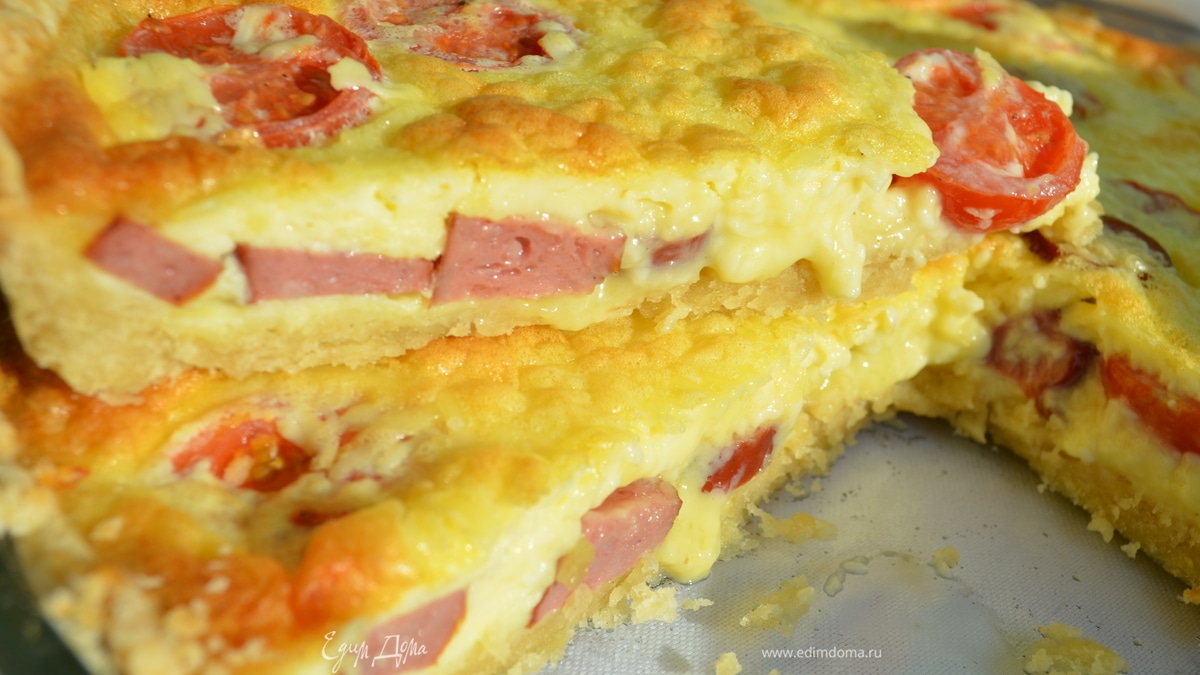 Начинка: Яйца взбить комбайном. Сыр натереть на мелкой терке и добавить к яйцам, вымесить на маленькой скорости, добавить сметану и специи. Помидоры разрезать пополам , колбаски колечками. В форму выложить помидоры и колбаски, залить смесью. На дно духовки поставить сковороду с водой. Форму с начинкой поставить в предварительно разогретую духовку и выпекать 40 – 50 минут при температуре 170 градусов. МИР ВАМ!