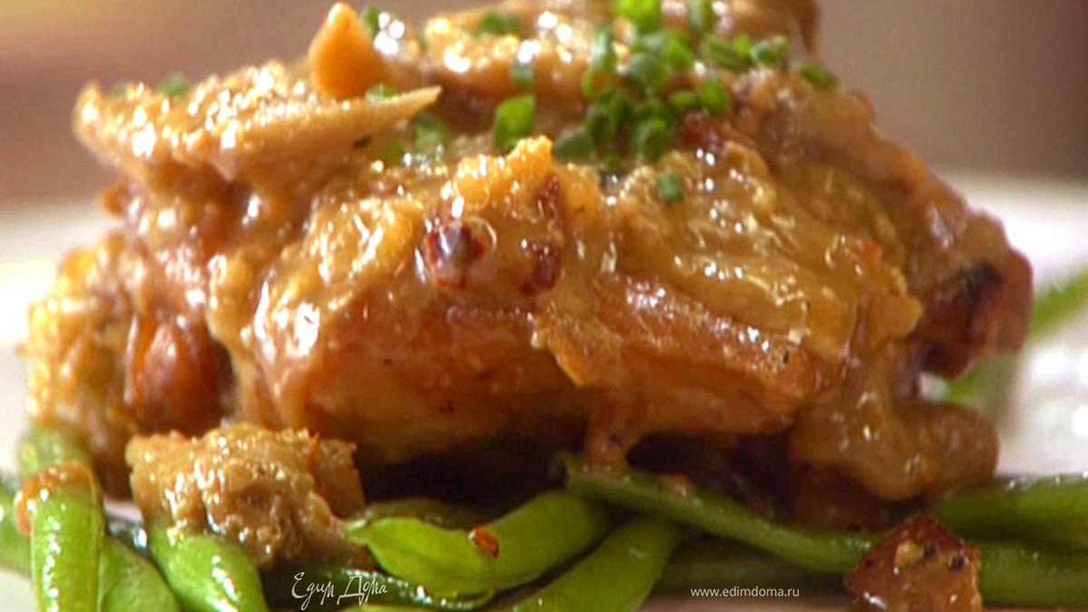 - Шаг 9Подавать курицу на подушке из обжаренной стручковой фасоли, полив миндально-грибным соусом. Украсить нарезанным зеленым луком.