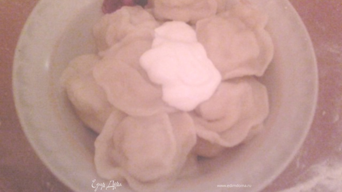 тесто тонко раскатать,вырезать кружочки,я вырезаю большим стаканом.положить на центр кружочка фарш и слепить пельмень. - Шаг 4пельмени отварить в кипящей воде ,6-7 минут после закипания.подавать со сметанкой.