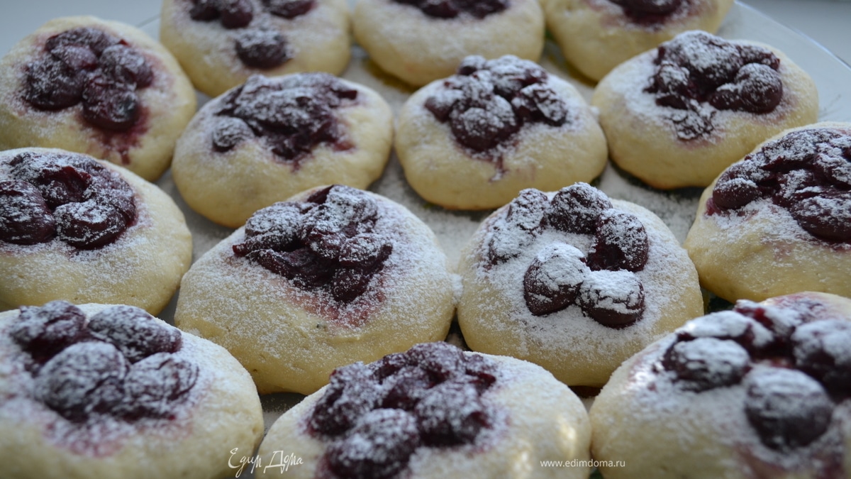 Отрываем кусочек теста, катаем колобочек, и выкладываем на противень прижимая пальцами в лепешку, сверху кладем вишню. - Шаг 3