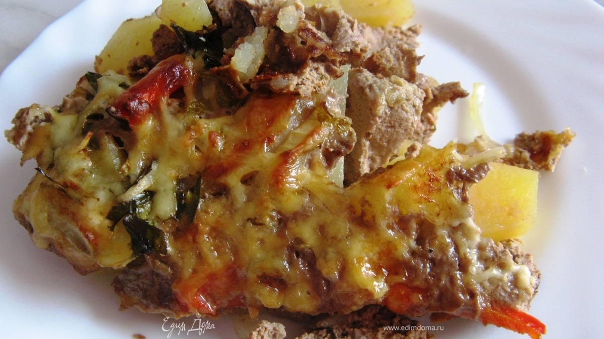 - Шаг 1Сначала замачиваем печень в молоке минут на 30. Затем перекладываем печень в блендер (без молока, его надо слить),$ кладем лук, перец болгарский, чеснок ,йогурт и яйцо с частью зелени. Взбиваем все в мусс. Солим. Берем глубокую форму для запекания ,смазываем ее немного раст.маслом выливаем наш будущий паштет. Картофель чистим режем, лук и перец тоже. Сыр трем на терке. Теперь кладем картофель в наш печеночный мусс, распределяя его по всей форме, сверху посыпаем луком, болгарским перцем и сыром. Запекаем все вместе минут 40 в разогретой духовке до 200гр.