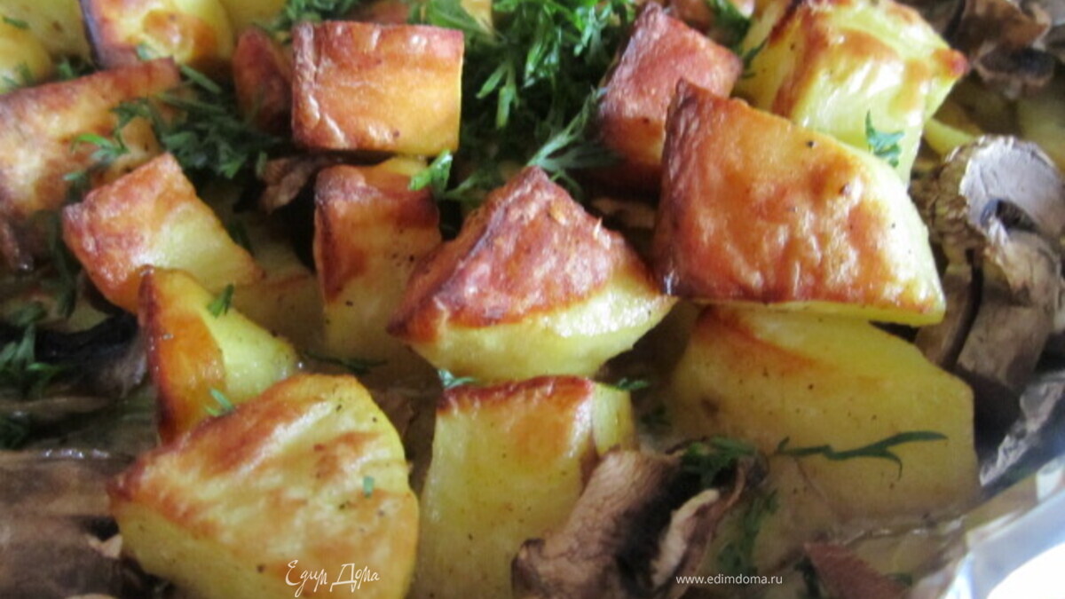постелила на противень фольгу и положила картофель с грибами готовила на 200 гр. 20 мин