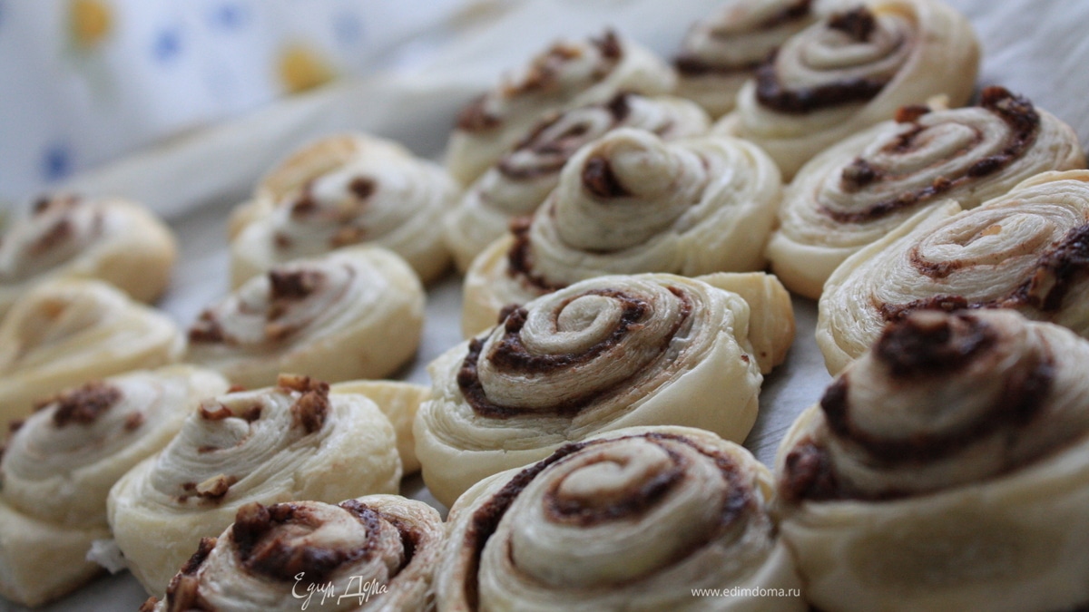 - Шаг 1Размороженное тесто аккуратно раскатать примерно на 3-4 мм. Начинку равномерно распределить по всей поверхности, скатать из теста рулет, нарезать его на дольки 1,5- 2 см.