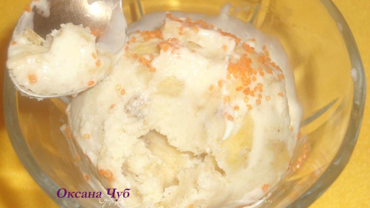 - Шаг 4Смешать остывшую сливочно-яичную массу с жареными бананами.Перелить в контейнер.Поставить в морозильник.Мешать каждый час.Готово часов через 6.Вкуснятина с кусочками бананов.Сверху можно украсить кондитерской посыпкой( у меня сахар крашеный).Это очень вкусно!!!!