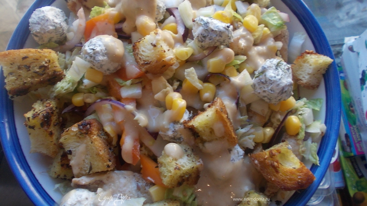 Смешиваем капусту,перчик,кукурузу,мелко нарезанный лучок,куриное филе,добавляем половина заправки-перемешиваем,выкладываем на блюдо,сверху кладем сырные шарики и крутоны и поливаем оставшейся заправкой.салатик готов.приятного аппетита!